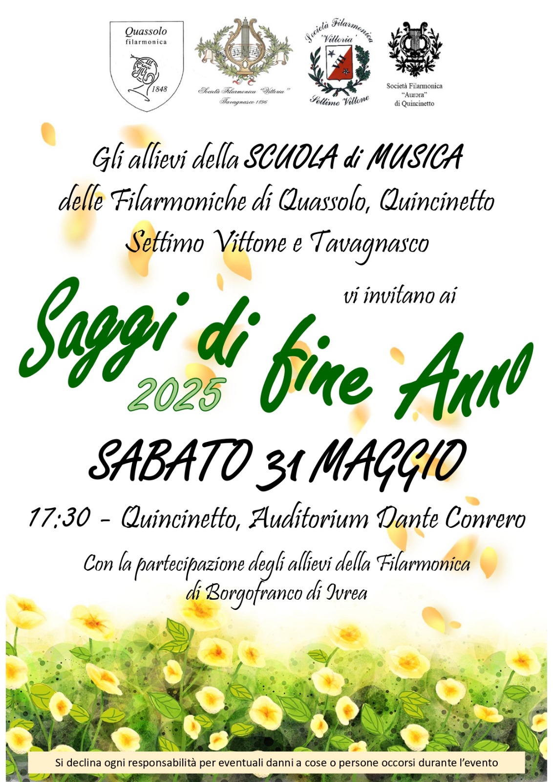 Gli allievi della Scuola di Musica delle Filarmoniche di Quassolo, Quincinetto, Settimo Vittone e Tavagnasco vi invitano ai Saggi di fine anno.